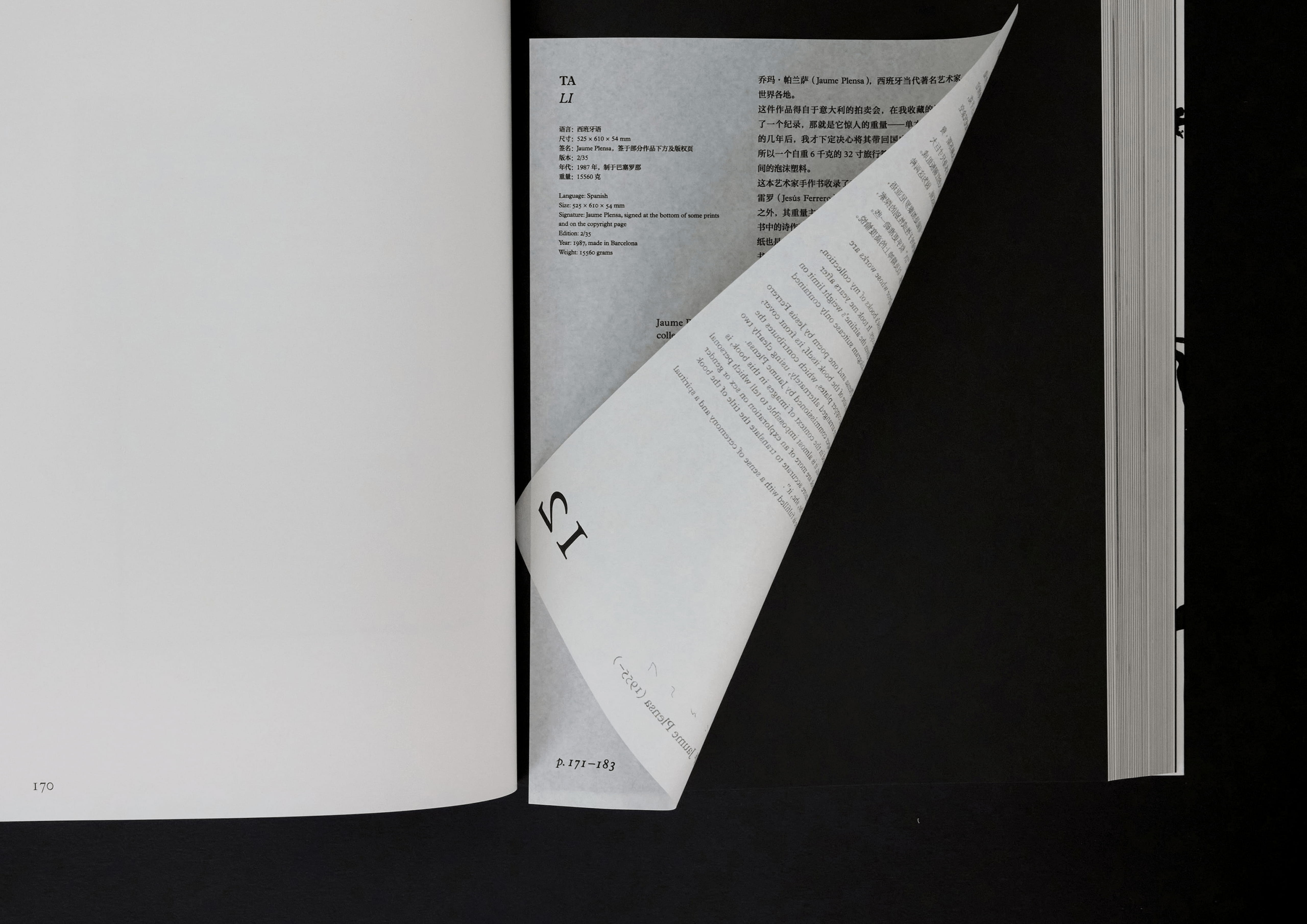 The back cover features an illustration inspired by the 50th artist’s book Philobiblon. The illustration contrasts with the photography on the front cover, as they stand for two different artistic creation languages. Besides, the black and white backgrounds respectively of the front and back covers also create a three-dimensional black-and-white space.